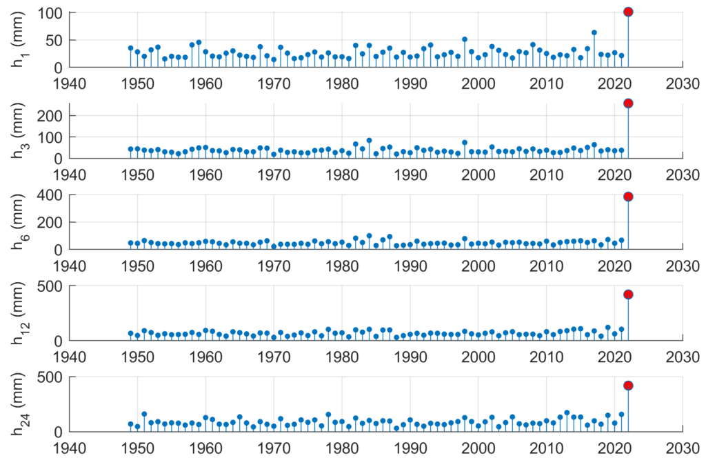 Figura 2 – Serie storica dei massimi annui di precipitazione per 5 diverse durate (1, 3, 6, 12 e 24 ore) del pluviometro di Cantiano, con indicazione degli estremi registrati nell’evento del 15 settembre.